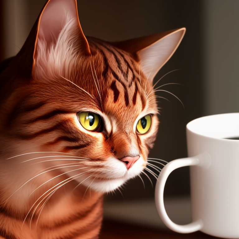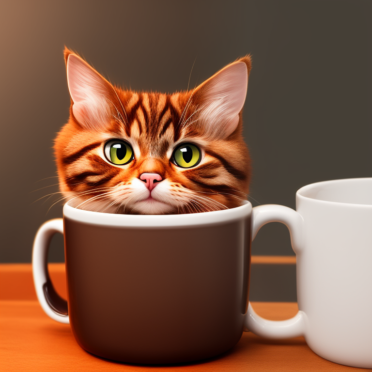 brown cat in the mug, closeup photo, kitchen background, dayligth