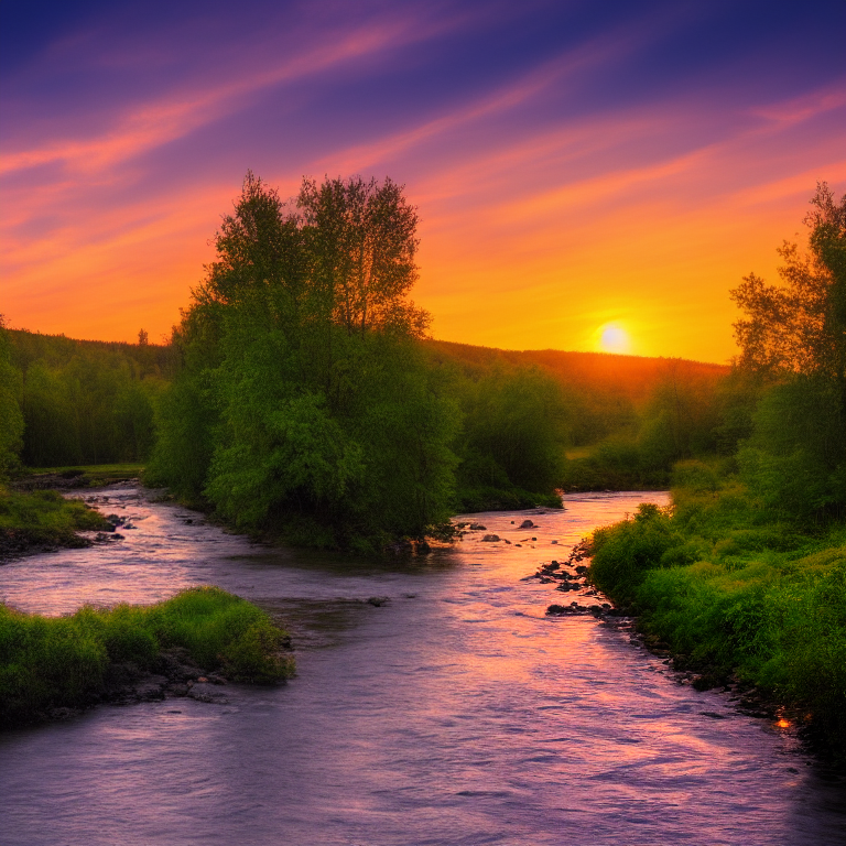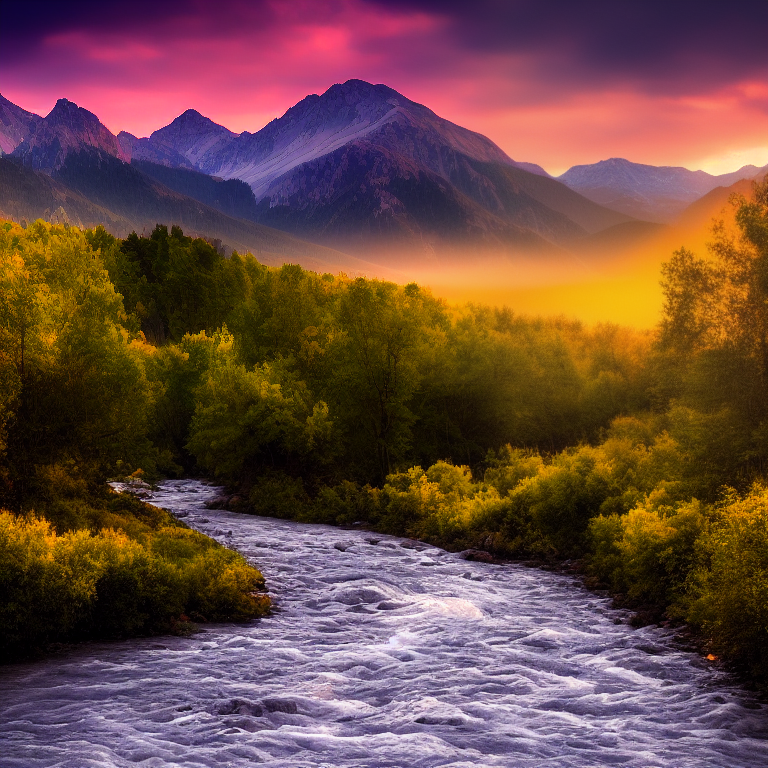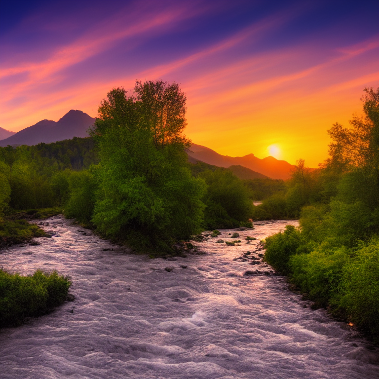 Hory hor, tak by se dala pojmenovat tato ukázka vážení promptu. Základní prompt zní beautiful landscape, mountains, rivers, trees, sunset .